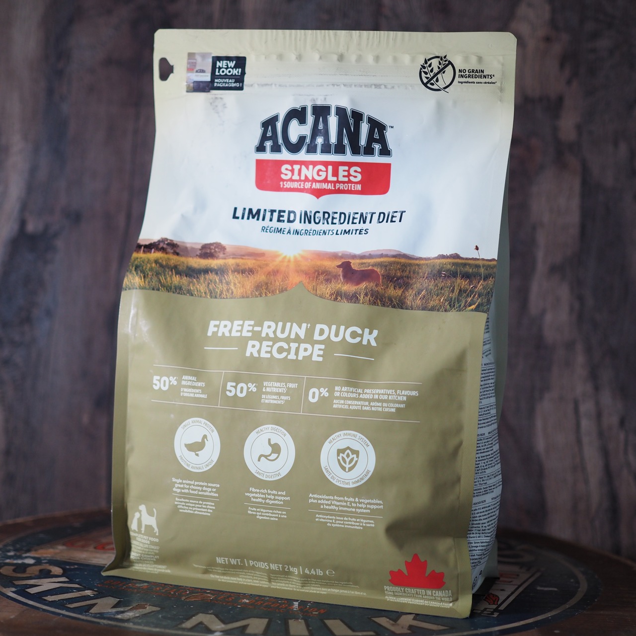 新鮮鴨肉 (18%), 乾燥鴨肉 (17%), 丸ごとグリーンピース, 丸ごと赤レンズ豆, 新鮮鴨内臓 (レバー, 心臓, 腎臓) (7%), 鴨脂肪 (6%), 新鮮バートレット梨 (4%), 丸ごとヒヨコ豆, 丸ごと緑レンズ豆, 丸ごとイエローピース, 乾燥鴨軟骨 (2%), レンズ豆繊維, 海藻 (1.2%) (DHAとEPAの純粋で持続可能な供給源), 新鮮丸ごとバターナッツスクワッシュ, 新鮮丸ごとカボチャ, 乾燥ブラウンケルプ, フリーズドライ鴨レバー (0.1%), 塩, 新鮮丸ごとクランベリー, 新鮮丸ごとブルーベリー, チコリールート, ターメリック, オオアザミ, ゴボウ, ラベンダー, マシュマロルート, ローズヒップ 酸化防止剤:天然成分から抽出したトコフェロール 添加栄養素(1kg当たり):ビタミンE: 100IU, アミノ酸水和物亜鉛キレート: 100mg, アミノ酸水和物銅キレート: 10mg 添加腸球菌:エンテロコッカスフェシウムNCIMB10415:600x10^6CFU