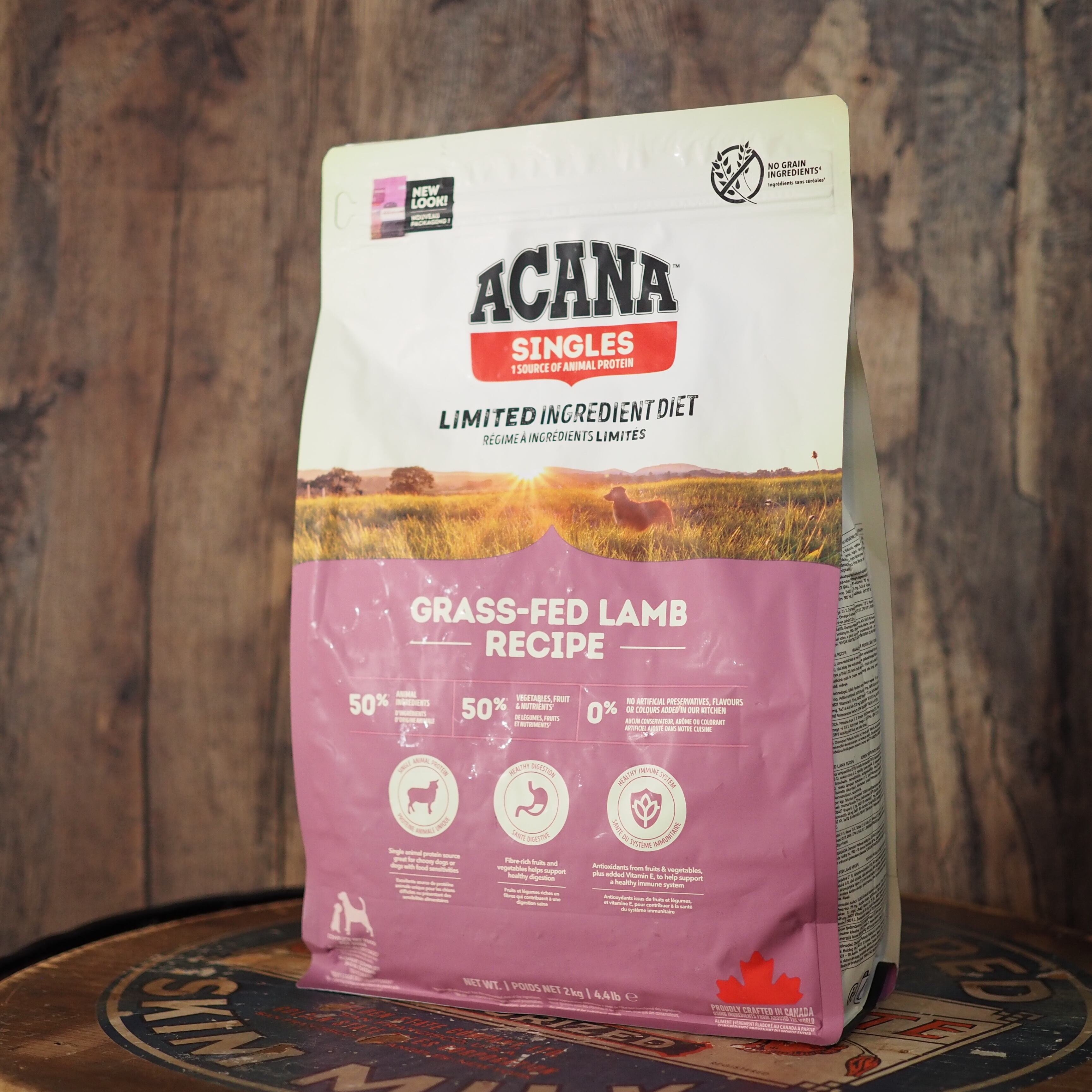 生ラム肉 (21%), 乾燥ラム肉 (19%), 丸ごとグリーンピース, 丸ごと赤レンズ豆, 生ラムレバー (8%), キャノーラ油, 新鮮リンゴ (4%), 丸ごとヒヨコ豆, 丸ごと緑レンズ豆, 丸ごとイエローピース, レンズ豆繊維, エンドウ豆スターチ, ヒマワリ油, 海藻 (EPAとDHAの供給源), 生ラムトライプ (1%), 生ラム腎臓 (1%), 新鮮丸ごとバターナッツスクワッシュ, 新鮮丸ごとカボチャ, 乾燥ケルプ, 塩, 乾燥チコリールート, 丸ごとクランベリー, 丸ごとブルーベリー, ターメリック, オオアザミ, ゴボウ, ラベンダー, マシュマロルート, ローズヒップ