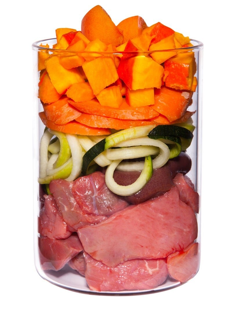 肉の含有量は62%、野菜・果物・ハーブ等を35%使用し愛犬にとって必要な栄養素の一つのカルシウムは有機卵殻の粉を使用しています。